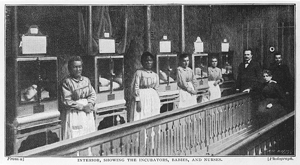 In 1890 Lion developed a smaller version of this incubator, especially for infants. In May 1890 he received his first prematurely born baby, thus expanding the exhibit with a living human child. The show was a success and in 1891 he expanded his business to Nice, where he founded a charity organization called "Oeuvre Maternelle des Couveuses d'Enfants."