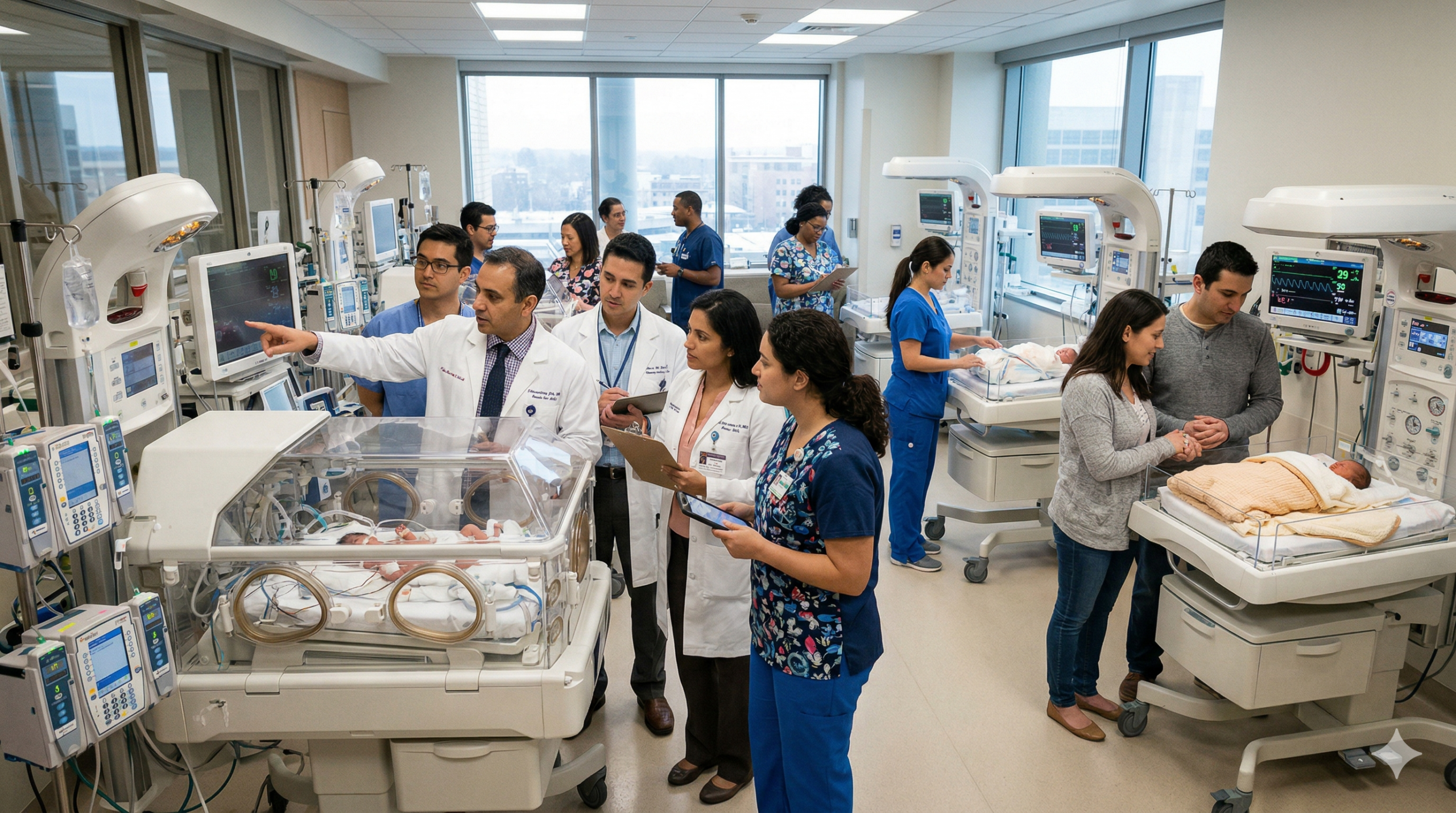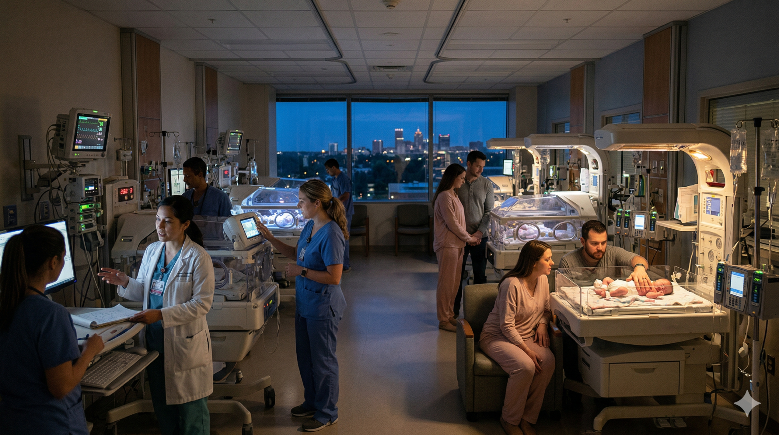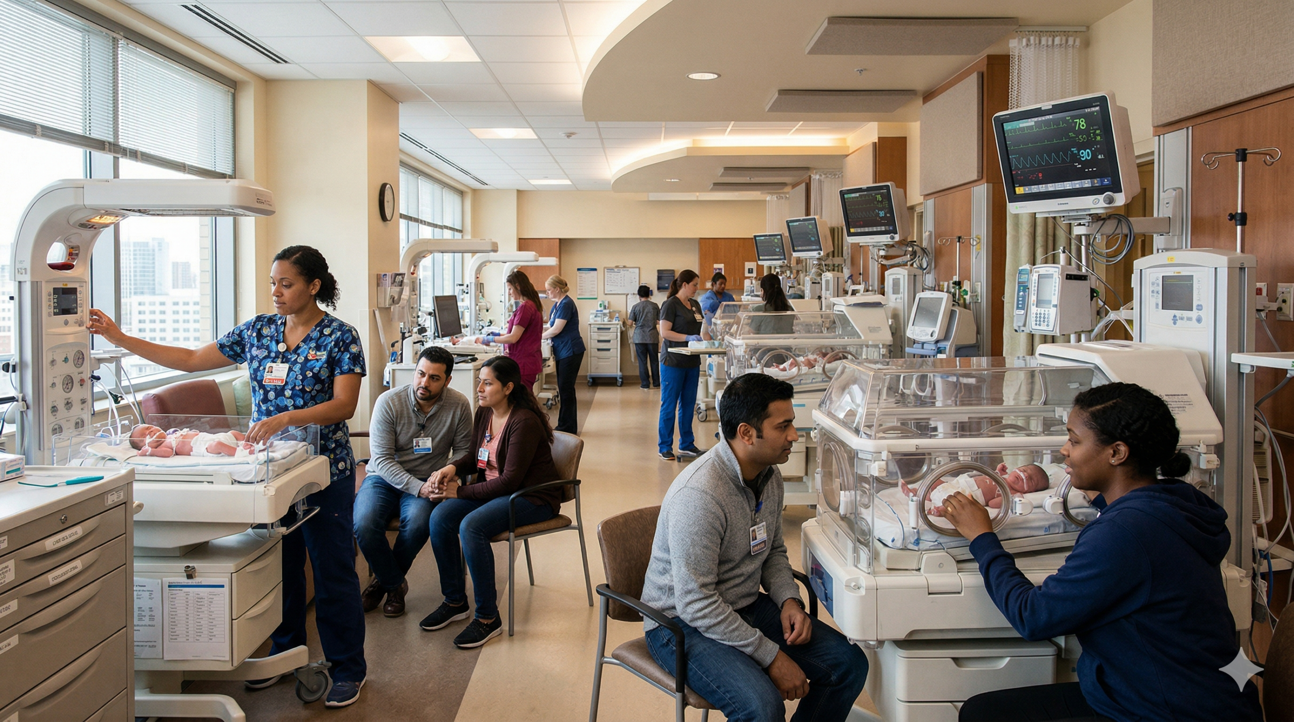 DALL·E 2024-03-09 09.16.23 – In a neonatal intensive care unit, a composed scene features a Hispanic mother seated a bit further back from an incubator, ensuring the swaddled newb