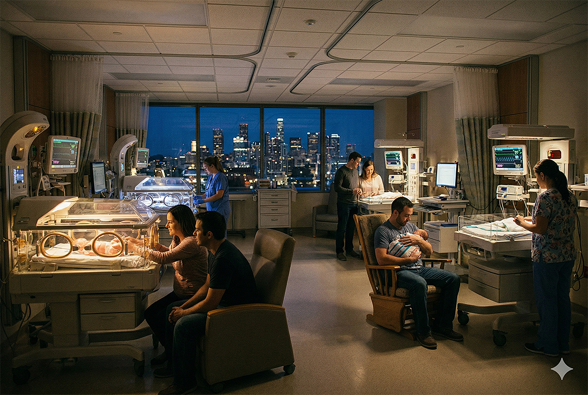 DALL·E 2024-03-08 18.16.56 – In a neonatal intensive care unit, a serene scene is depicted where a mother sits quietly next to an incubator. Within the incubator lies her newborn,
