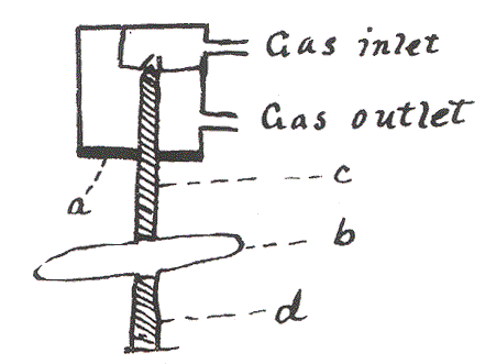 The heat supply was controlled by a thermoregulator in the upper rear corner of the incubator chamber. A hollow tin disk filled with ether pressed upon an iron pin which passed through a soft rubber disk into the opening which admitted the gas (Fig. 6). As the incubator became warmer the disk expanded and forced the point of the pin into the opening and thus cut off the gas supply. Theoretically it seemed a very simple and ideal thermostat, but practically the stability of the whole heating apparatus had much to be desired. We were not able to dispense with constant intelligent supervision of the heating apparatus, although the thermoregulators could be depended upon to turn down the gas flame when the incubators became too warm. The causes which forced us to supervise the heating and air supply will be discussed below.