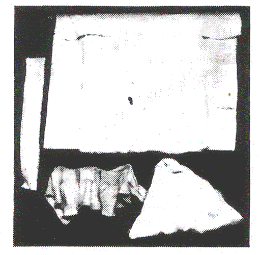 The subjoined halftone (Fig. 7) illustrates the articles of clothing for a premature infant: a soft woolen shirt, a diaper, flannel band, cotton and a covering of gauze in which the body is wrapped. Eross was probably correct in attributing little warmth to these envelopes of cotton — loose cotton is not warm. A soft light woolen blanket would really seem preferable in private practice, or lamb’s wool should be used instead of cotton. We recall one instance where a father bought a premature infant safely to the incubators which had been wrapped in absorbent cotton and then enveloped in several thicknesses of a blanket. It would seem safer to substitute some thick woolen goods for the gauze to be used over the cotton. The diaper in all cases consisted of a layer of absorbent cotton and sterilized gauze (Fig. 8). Every morning and evening enough of these diapers were made for half a day. As soon as they were wet or soiled they were discarded and burned. When it is known that we used about $5.00 worth of sterilized gauze daily just to make napkins it will be seen what expense is found in such an institution. In no case was it permissible to change the diaper of one baby for that of another when slightly wet and then dried.