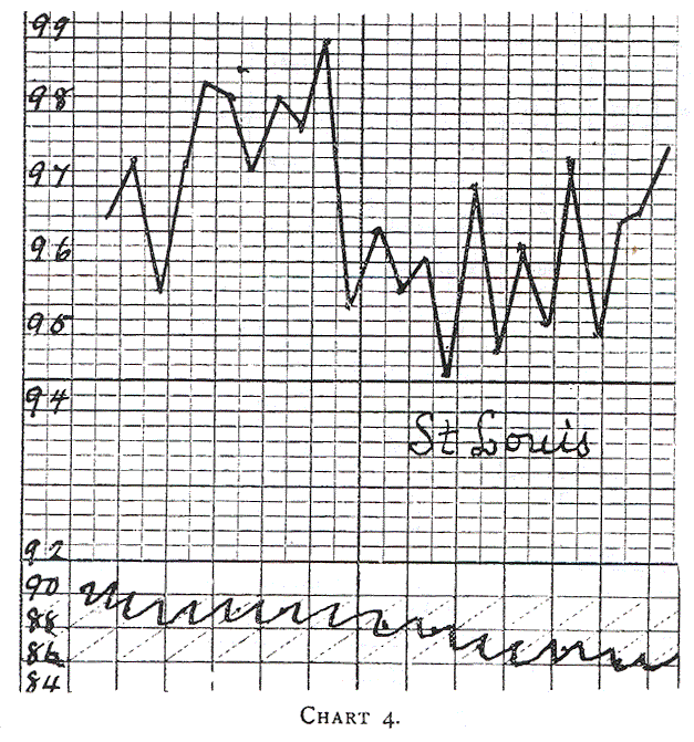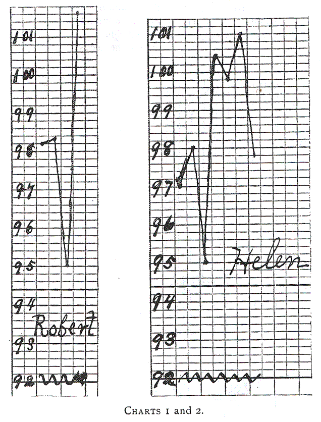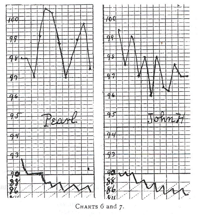 Charts 1 to 7 illustrate the relation of the incubator and rectal temperatures in geometric curves. The upper curve gives the rectal temperature twice daily, while the lower zig-zag line illustrates approximately the temperature of the incubator. A complete correspondence is not seen, other factors enter into the augmentation of the temperature, such as the food supply, digestion, etc.