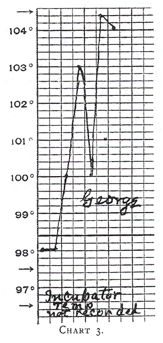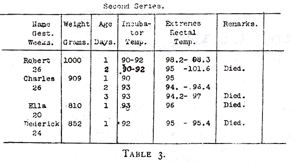 It is unfortunate that I find no records of the incubator temperature in the first series, but I have been assured that the babies were kept very warm (about 94°). Nearly all of them had fever and consequently did not do well.