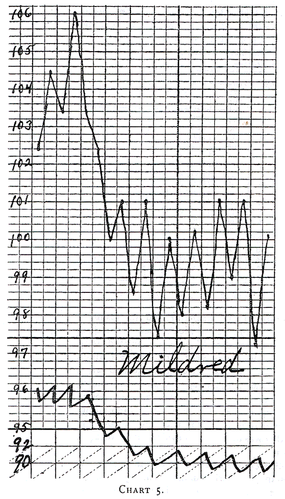 A high temperature of the incubator and its results is exemplified in the case of Mildred of the first series (see chart 5). Owing to the incomplete data I have not tabulated additional cases. This case illustrates very forcibly the harmful effects of fever in the early stages. Even in the second series, in all instances there was a tendency to febrile movement, probably due to overheated incubators. Great precaution to prevent subnormal temperatures and consequent cyanosis suggested the temperatures (90-92°); yet, with the exception of the first few hours, this was too high, as evidenced by restlessness and perspiration.