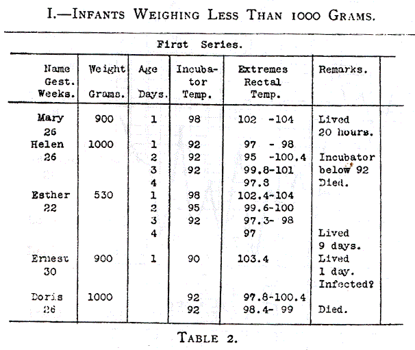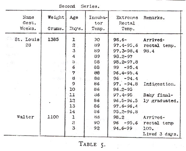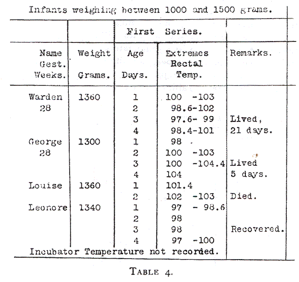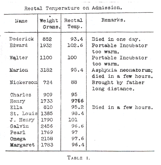 In the earlier months of this institution my predecessors used a much higher temperature for the incubators. Probably their practice was based on the experience of Rotch and the recommendations of Blair, whose paper had just appeared. We maintained a lower temperature of the incubators during my service and it may be instructive to study the results more carefully. It is an undisputed axiom that the incubator should be kept no higher than what is necessary for the individual infant. The heat in the incubator must be adjusted to the needs of the individual.