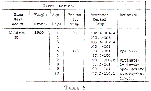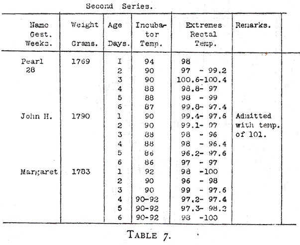 In the second series, in spite of the fact that the incubators were kept at a much higher temperature than demanded by Budin, the infant’s rectal temperature fell below the minimum point permissible (97°). (Tables 6 and 7).