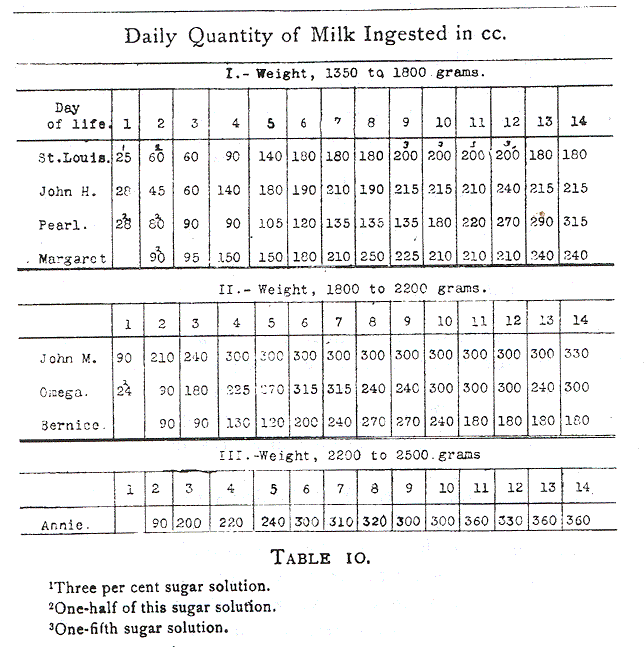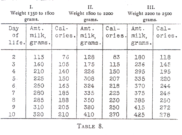 In the accompanying Table 8, I reproduce the average amount of milk which he gives during the first ten days of life, but have taken the liberty to annex the caloric value, based on an average composition (650 calories to the kilogram).