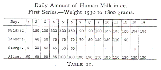 From this Table it is seen that the quantity given, with the exception of the first baby, was less than the averages laid down by Budin. Still most of these were near 1350 grams in weight. Mildred was overfed the first day and, consequently showed marked dyspeptic symptoms lasting for many days, in spite of the reduction of the daily quantity.