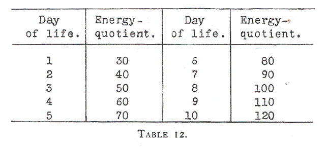2. On the following days the energy quotient should receive an increment of ten every day, so that an energy quotient of 120 calories is reached by the tenth day. The quantities are represented in Table 12.