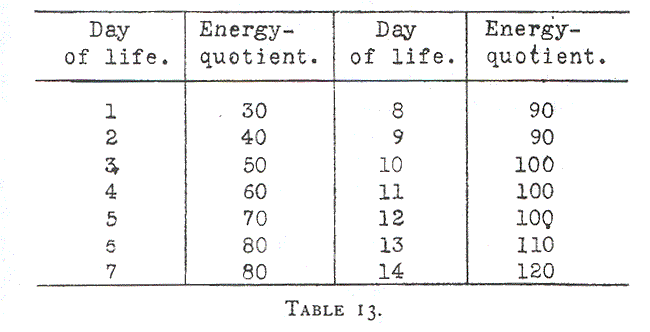 3. In many cases it is best to increase more gradually, especially if slight dyspeptic symptoms occur. It will be found more safe to keep the energy quotient the same for two or three days after reaching eighty, as indicated in Table 13.