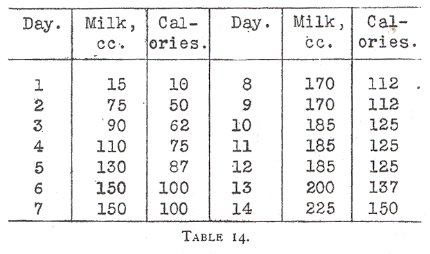 Note — the first few days the total calories were increased by giving sugar-water. Where a discrepancy between the milk and calories appears it is due to the calculated calories in the 5 per cent sugar water.