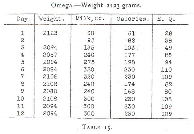 Of course, all these figures are given in round numbers, I can not claim that extreme accuracy is necessary. It should also be noticed that this is a hypothetical case, calculated on the basis of birthweight; but as the weight decreases during the first week the figures are somewhat too large. Each time the baby is weighed, and as we shall see, it should be weighed every day, the quantity of food for the next twenty-four hours should be calculated. Now, while this may seem very complex, in a given case a more simple rule can be followed, but this rule should remain the standard by which other milk schedules may be judged. Here is an example from actual life at the Baby Incubators (Table 15) and illustrates the harmful results of trying to feed too much.
