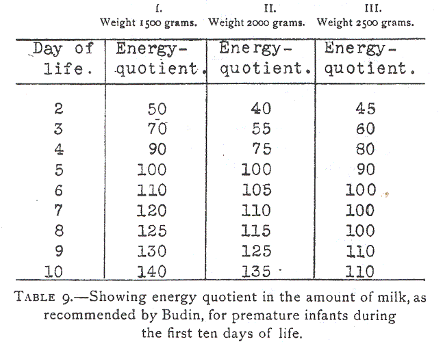 Most authors find it sufficient to give the quantity at a feeding and the intervals. Budin, however, lays down definite rules, and from his large experience these rules must be considered most precise and extremely practicable. It should be remembered, however, that this physician only considers infants weighing more than 1200 grams at birth.