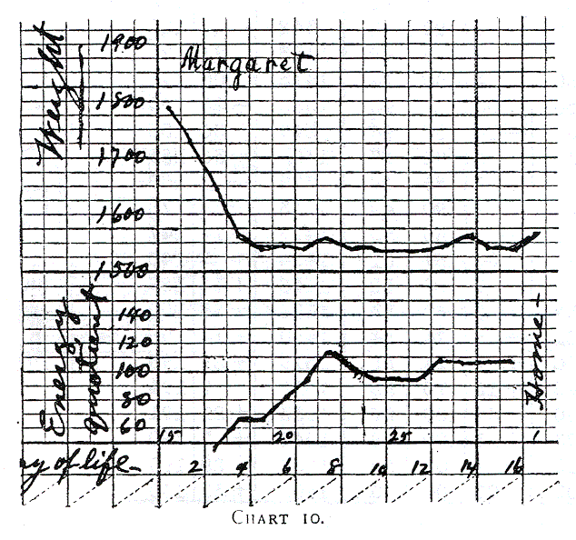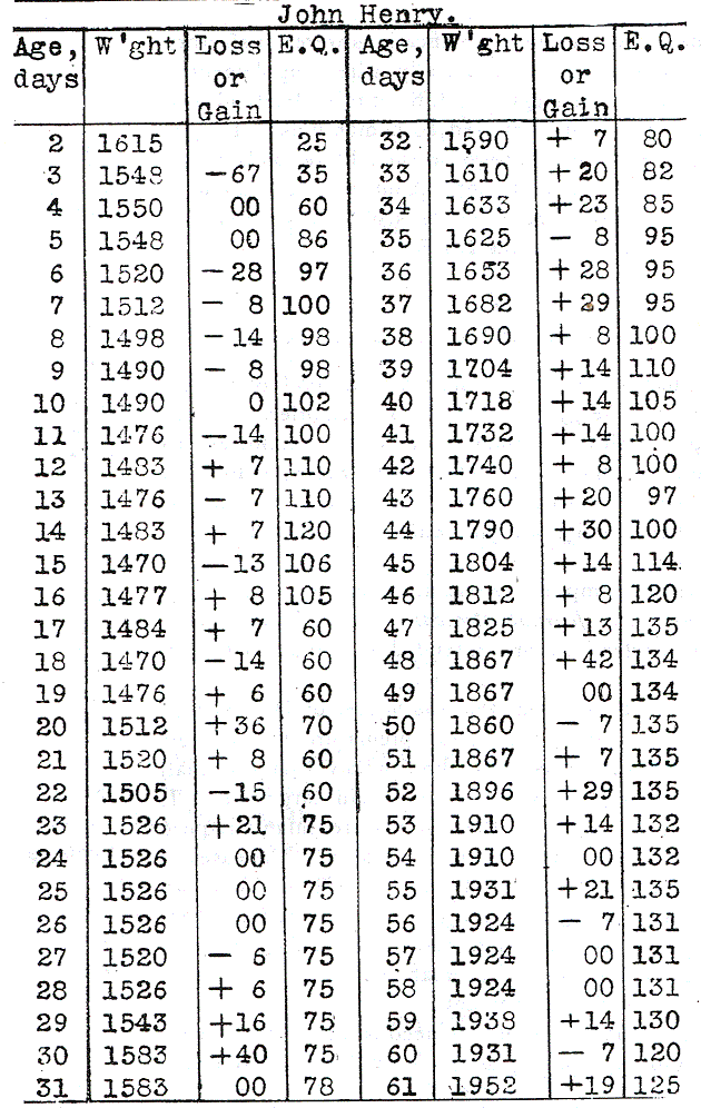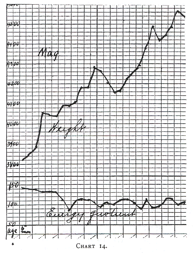 In analyzing the record of the food and weight of John Henry (Table 16) several interesting facts may be noticed. In the first place, trying to increase the milk in the first two weeks as rapidly as Budin directs, a severe attack of indigestion was induced. On the fourteenth day with the alimentation having an energy quotient of 120 calories, about what his rule of feeding would give, our patient had frequent green stools showing undigested food. Moreover, he had several attacks of cyanosis and subnormal temperature. On the seventeenth day the food had to be decreased and an additional supply of water given. The dyspeptic symptoms disappeared in about ten days, and he began to have a good daily gain on a quotient energy of about 75 calories. It will be observed that during the ten days (27th to 37th day of life) he gained 162 grams, or an average of 16 grams a day. This record rather supports the assertion of Czerny and Keller (Des Kinder Ernahrung, page 385) that some infants gain 15 grams daily on an energy quotient of 70 calories. During another period (46th to 56th day of life), with an energy quotient of 130 calories, he gained only 112 grams, or an average of 11 grams daily. Of course, the first period was immediately after a period of indigestion and loss in weight; the gain may be probably accounted for by a storing of water. Another period when the quotient energy was near 100 calories (35th to 45th day) gave a daily gain of 18 grams. A much higher quotient energy gave no higher gain. Even later, when on account of supplying his hunger, or putting him to the breast he took a still larger quantity of milk his gain was no greater. Table 17 gives a brief resumé of his subsequent history.