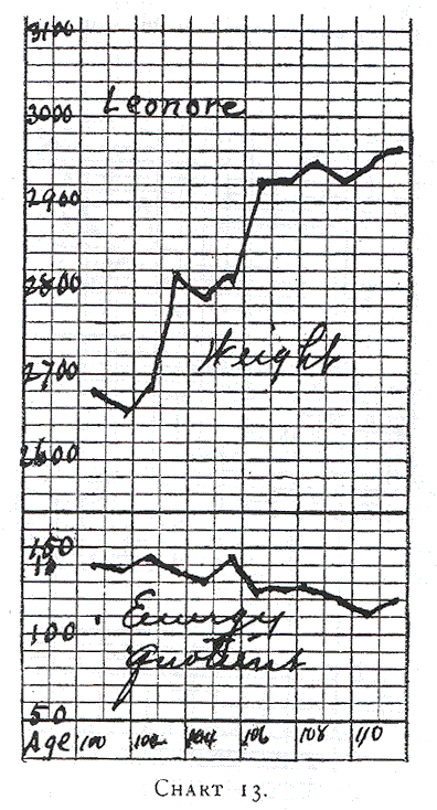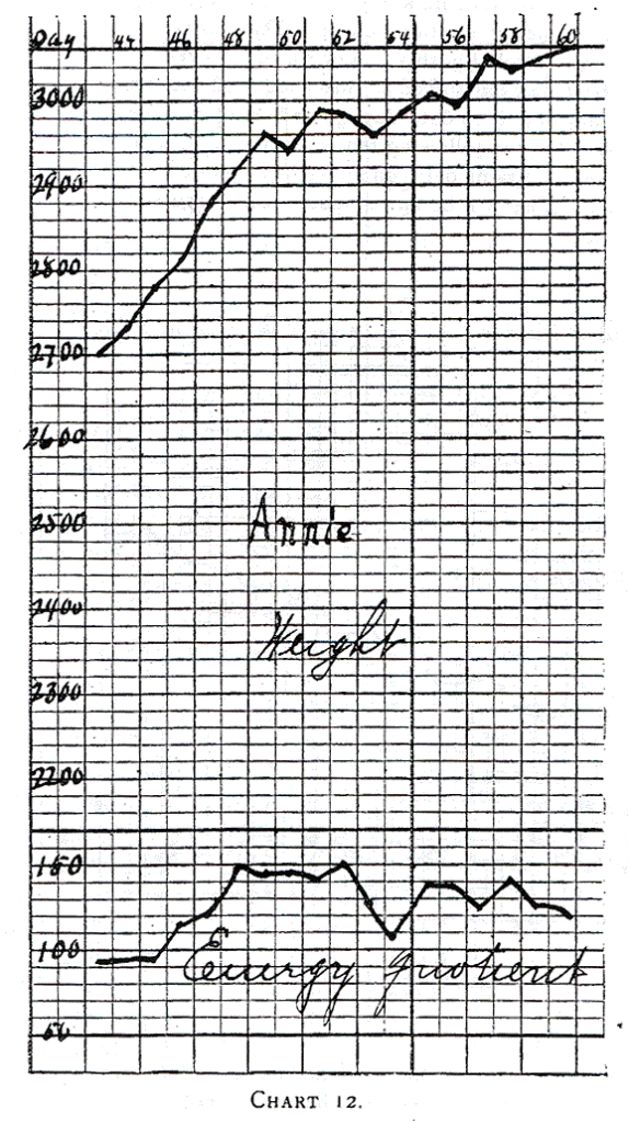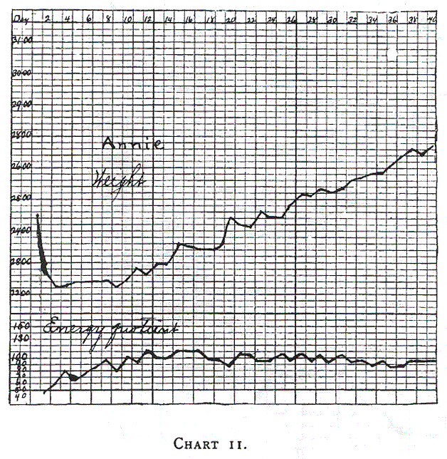 Annie (Chart 11) illustrates the gradual increase of food, and how the loss in weight is checked when an energy quotient of 70 calories is reached. She gained nicely on an alimentation having an energy quotient of 95 to 100 calories. Chart 12 shows how a larger increase of food does not increase the gain in weight but slightly. An energy quotient of 150 calories was too large. She gained very rapidly (30 grams daily) on a food having an energy quotient of 120 to 130 calories (58th to 64th day). She was a large baby to begin with and her growth was uninterrupted.