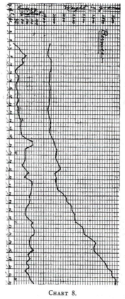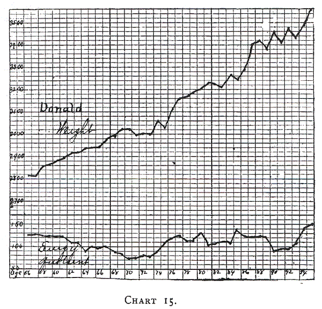 Charts 13, 14 and 15 (Leonora, Mag. and Donald) illustrate the growth on mixed feeding. These were graduates, and the curves show their food and weight during certain periods of their life. Again, we notice that an energy quotient of about 120 to 130 calories is most satisfactory. Higher quantities give rise to indigestion. When the energy quotient is the same, and digestion is perfect it is impossible to draw any distinction between modified cows’ milk and human milk in these older babies.