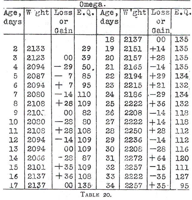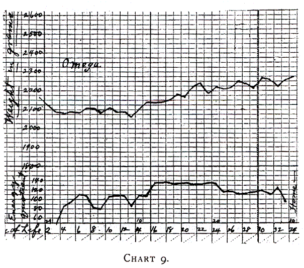 Omega (Table 20 – Chart 9) was a large baby and we should expect a larger gain on the same energy quotient, but as a matter of fact we find no great difference. The first period of ten days (15th to 25th day) with an energy quotient of 10 to 130 calories the average daily gain was only about 15 grams. On the following ten days, with a lessened food supply, the gain was about 4 grams daily. This was caused also by slight indigestion superinduced by excessive feeding (17th to 24th day). It only emphasizes the fact that it is dangerous to give an alimentation that exceeds an energy quotient of 120 calories during the first few weeks.