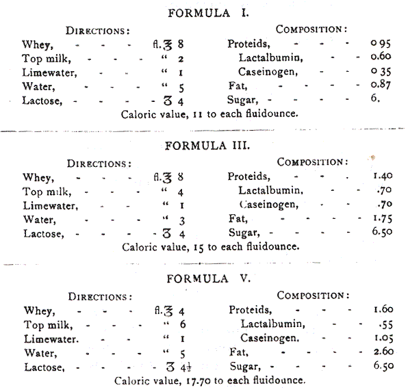While the whey and milk modifications were satisfactory as a food for the older infants, especially when supplemented by one or two breast feedings, it is difficult to understand how such a mixture could be preferred to human milk. To give the infant a proper caloric strength in such dilute foods necessitates the administration of large quantities. I imagine it would be very hard to give a ten-days old baby an energy quotient of 100 in a formula like No. 1.