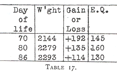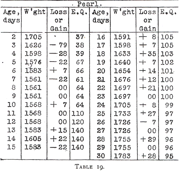 In the case of Pearl (Table 19) the alimentation had to be reduced on the fifteenth day as dyspeptic symptoms appeared. From the fifteenth to the twenty-fifth day with an energy quotient near 100 calories the average daily gain was about 15 grams. Following this period the food quality was relatively less and the gain in weight was correspondingly less.