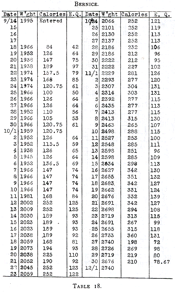 In the case of Bernice (Table 18, Chart 8) I feel sure that our method of feeding was rather too cautious at the beginning. In her case the method of feeding based on the energy quotient had not as yet been adopted. Notice the sharp rise in weight on September 22nd, when the energy quotient on the previous day was near 100 calories. She certainly corroborated the view of Heubner that an infant can not gain on an energy quotient of 70 calories or less. The first good gains are reached when the energy quotient is over 80 calories. During the period of October 11th to 21st (energy quotient near 90 calories) she gained an average of 6 grams daily. During the period of October 22nd to November 1st, with an energy quotient of about 110 calories, she gained 8 grams daily. On the following period of ten days the average gain was 29 grams daily, with an energy quotient of nearly 115 calories.