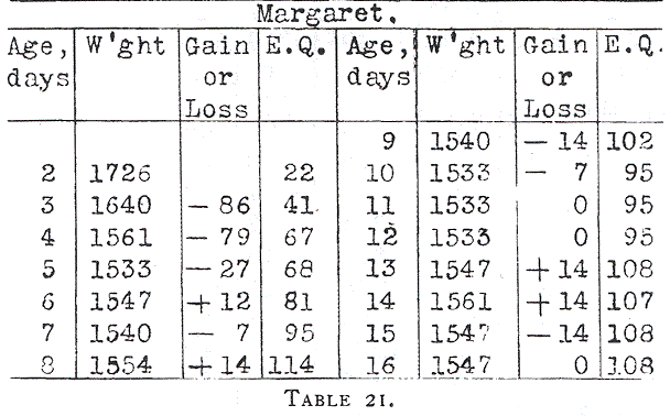 The rapid increase in the food in the case of Margaret (Table 21) did not succeed in producing a rapid gain. Time must always be allowed for the weak digestive apparatus to adapt itself even to mother’s milk. She did not stay with us long enough to determine digestive power as the Institute closed and she was sent home in good condition.