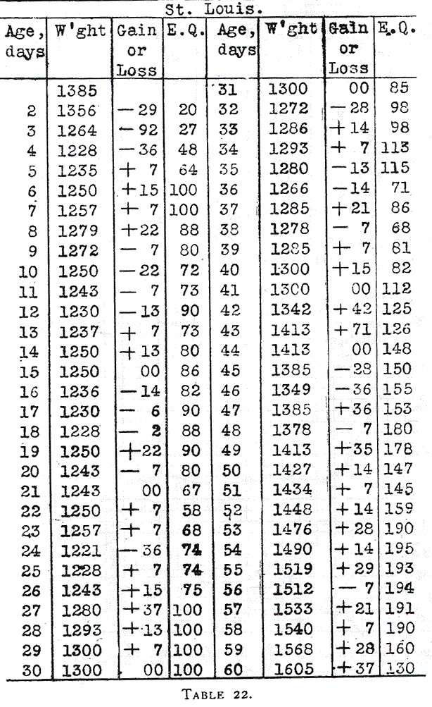 The history of St. Louis (Table 22) is exceedingly instructive. By the rapid increase of the food to an energy quotient of 100 calories on the sixth day the initial loss in weight was checked, but an indigestion followed which was treated by a reduction in food, and for twenty days there was no gain in weight. On the twenty-seventh day there was a great improvement in stools and the food was increased to an energy quotient of 100 calories. But pushing the food beyond that again brought on greenish stools. On the forty-first day the infant had not yet regained its original weight, and the stools having improved a forced alimentation was tried, gavage being used at times. Mother’s milk was given in increasing quantities so that its energy quotient on the fifty-fourth day reached 195 calories. Probably this was overfeeding — yet the infant gradually became accustomed to this food and on the following twelve days (48th to 60th day) gained on an average of 19 grams daily. On the following ten days (not shown in the table) he gained 10 grams daily on an energy quotient of 130 calories. His history will be more specifically discussed under “Indigestion.”