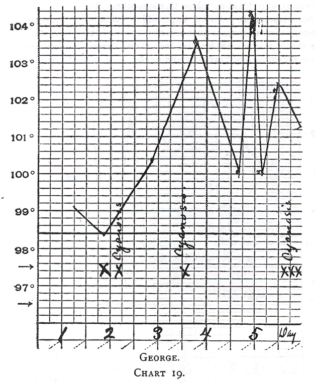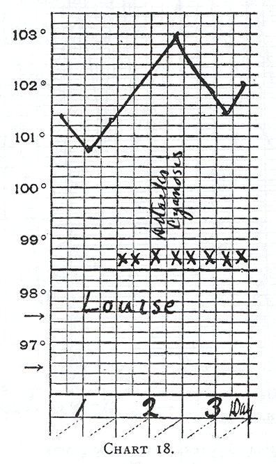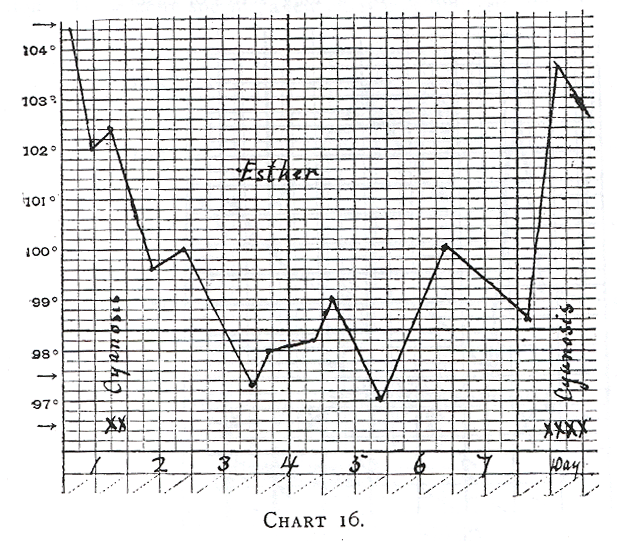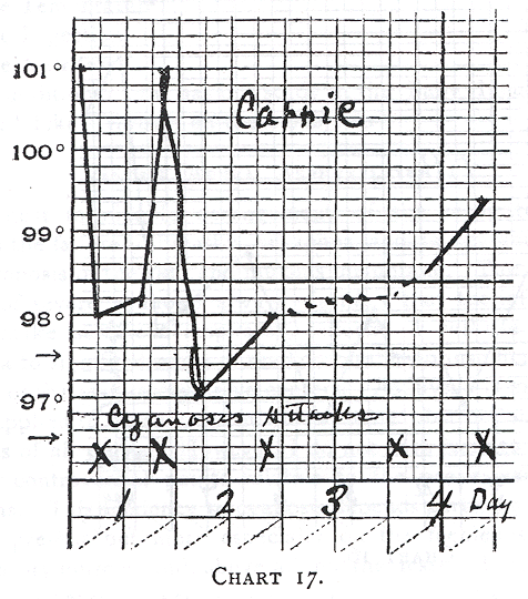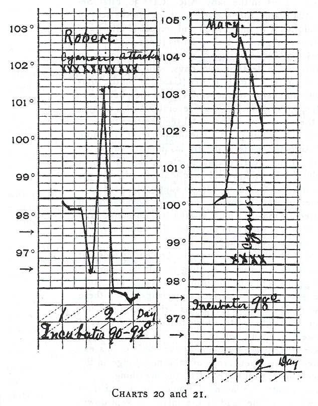 The next question to be answered is what relation has the rectal temperature to the appearance of cyanosis? Budin gives the cooling of the body as a cause, and no doubt he is correct. On the other hand, it must not be forgotten that the cooling of the skin is one of the most powerful stimulants to respiration (see Knapp, Scheintod der Neugeborenen, for a discussion of this subject). Furthermore, an elevation of temperature also endangers life by causing the appearance of cyanosis. This is well exemplified by a series of cases (First Series) in which the incubator was kept at a relatively high temperature (94 to 98°). See the relation of the high temperature and cyanosis in Charts 16 to 21. Especially in the case of Esther (Chart 16) the cyanotic attacks indicated by the sign X, were manifest only when the rectal temperature was over 102°. Hence, an elevation of temperature over 102° predisposes to cyanosis. This is another reason why the incubator should not be kept too high. But even when the temperature is perfectly normal (Chart 21), as in the case of Robert, repeated attacks of cyanosis may appear.