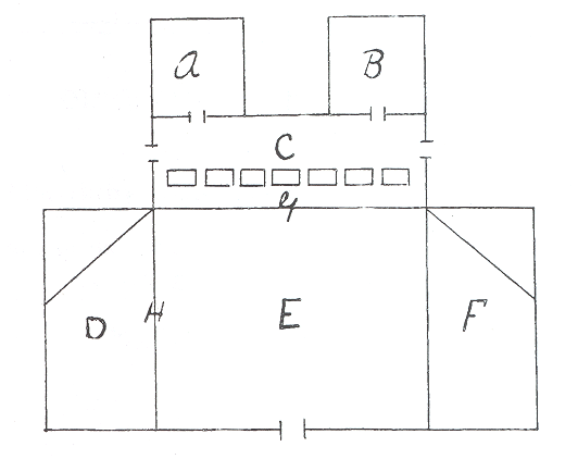 Fig. 11 — Diagram illustrating the ground plan of a public institution for Baby Incubators. a, Dressing room for healthy infants. b, Dressing room for infants showing some mild infection. c, Room for incubators. d, Nursery for healthy “graduates.” e, Room for visitors, separated from c and d by glass partitions g and h. f, Baby hospital room for contagious diseases.