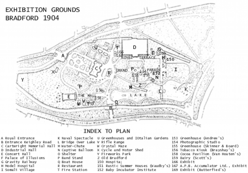 - Flickr / Bradford Timeline — Bradford Exhibition 1904 album (souvenir postcards and photographs) https://www.flickr.com/photos/bradford_timeline/albums/72157632128178141/