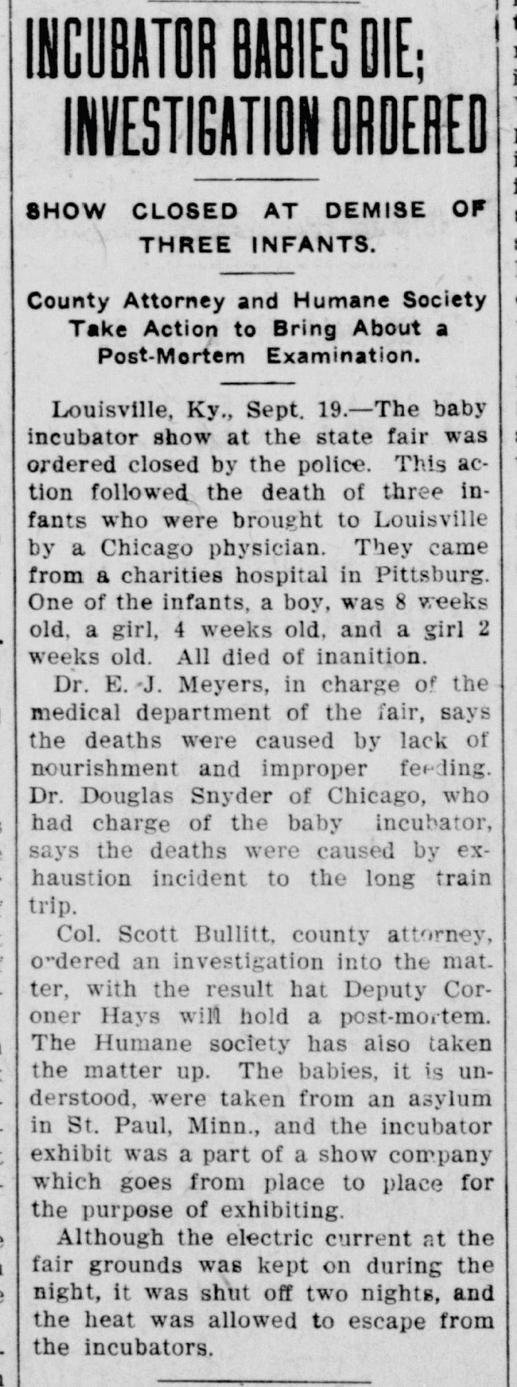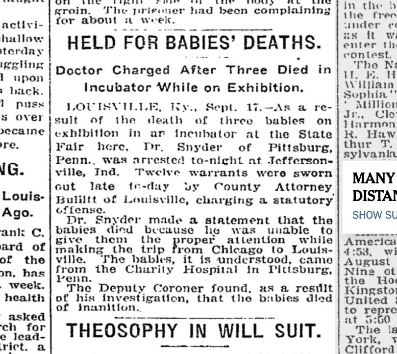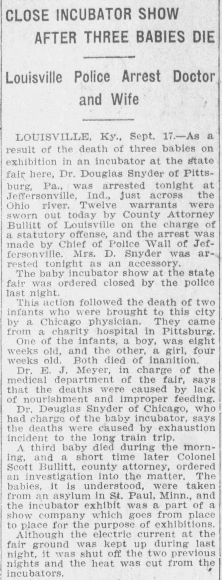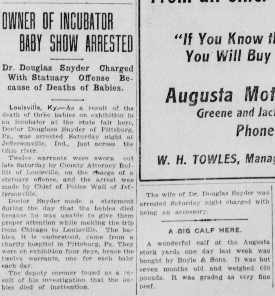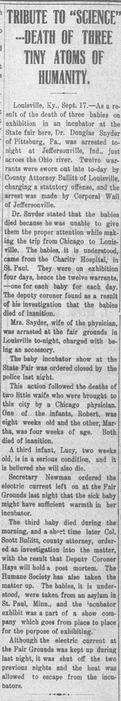 In September 1910, the Kentucky State Fair in Louisville featured a “Baby Incubator” exhibit that became the subject of national news following a tragedy, in which three premature infants died while on display. The infants were variously reported to have been brought to the exhibition from an “asylum” in St. Paul, Minnesota or a “charities hospital” in Chicago. The exhibition was shut down by police following the deaths. The manager or proprietor, Dr. Donald Snyder of Pittsburgh, was arrested in Jefferson, Indiana, along with his wife, who was arrested as an accessory.