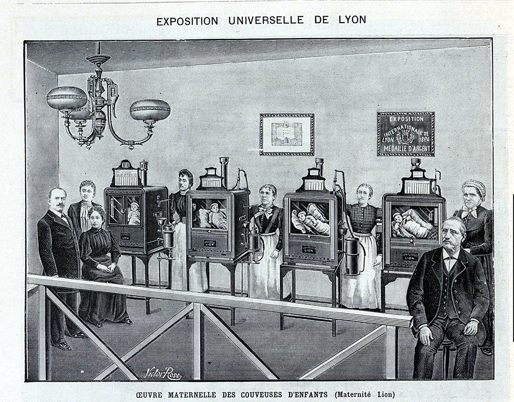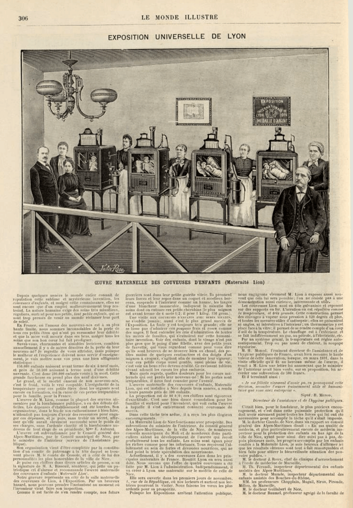 The Exposition Universelle, Internationale et Coloniale was a world’s fair including a colonial exhibition held at Parc de la Tête d’or in Lyon, France in 1894. The 1894 Exposition in Lyon included the first known exhibition of incubators and human babies at a World’s Fair by Alexandre Lion. Dr. Lion operated storefront “institutes”” with incubators and human babies in several cities in France, and also had incubator pavilions at many international exhibitions in both Europe and the United States around the turn of the century.