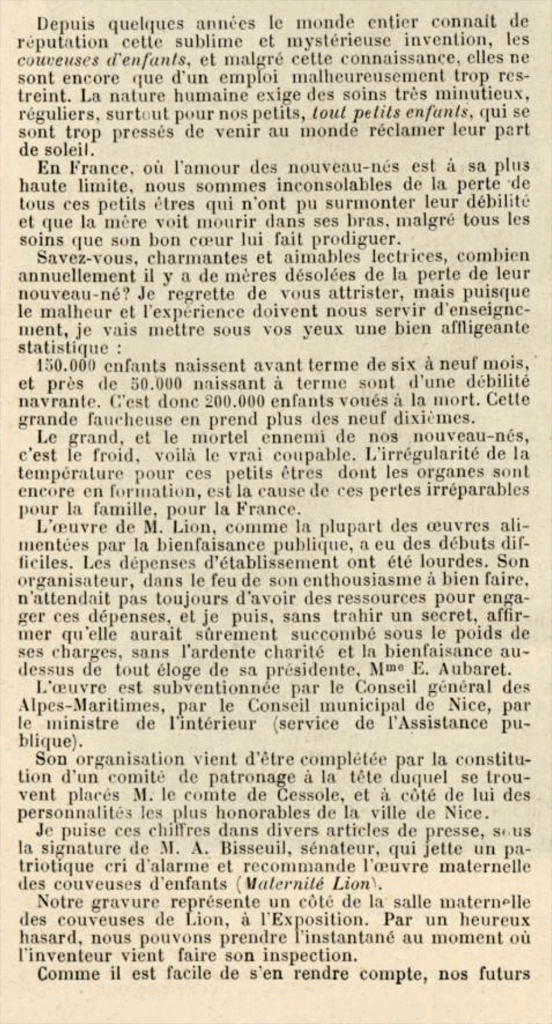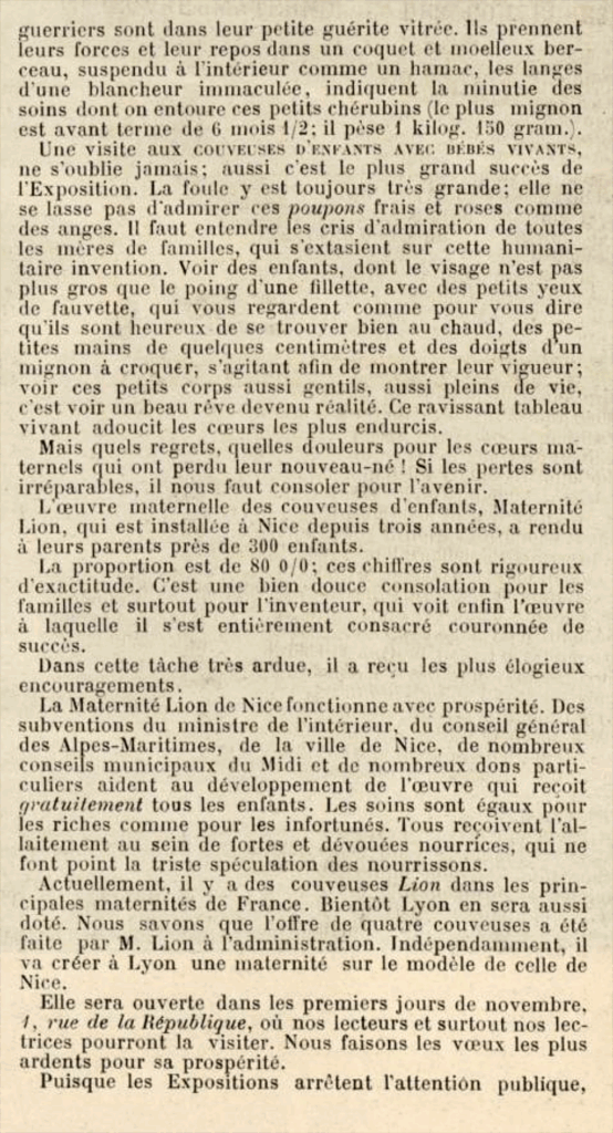But what regrets, what sorrows for the mothers who have lost their newborns. If the losses are irreparable, we must find solace for the future. The maternal work of the infant incubators, Maternité Lion, which has been located in Nice for three years, has returned nearly 300 children to their parents. The ratio is 80%; these figures are rigorously accurate. This is a sweet consolation for families and especially for the inventor, who finally sees the work to which he devoted himself entirely crowned with success.