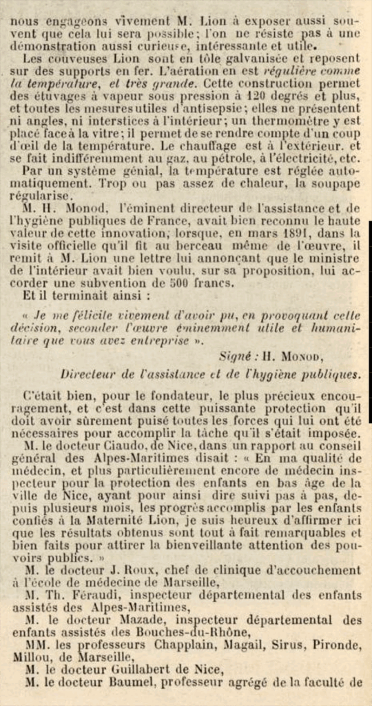 Dr. Ciaudo of Nice, in a report to the General Council of the Alpes-Maritimes, stated: “In my capacity as a physician, and more specifically as the medical inspector for the protection of young children in the city of Nice, having followed, so to speak, step by step, for several months, the progress made by the children entrusted to the Lion Maternity Hospital, I am pleased to affirm here that the results obtained are quite remarkable and well-suited to attract the benevolent attention of the public authorities.”