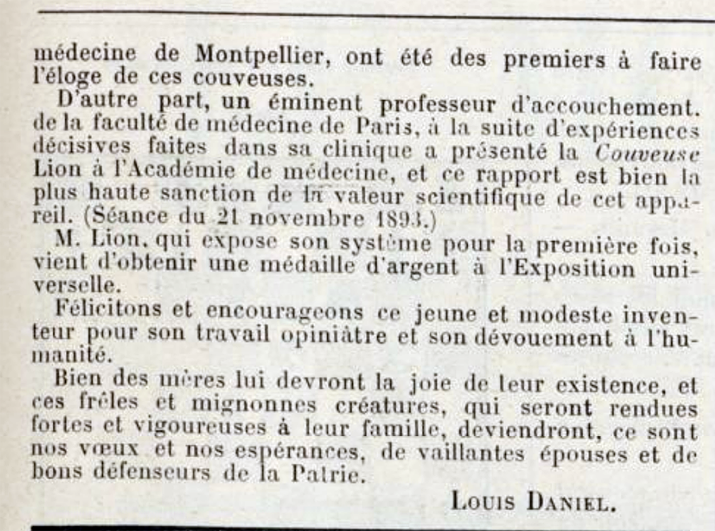 Furthermore, an eminent professor of obstetrics at the Paris Faculty of Medicine, following decisive experiments conducted in his clinic, presented the Lion Incubator to the Academy of Medicine, and this report is indeed the highest endorsement of the scientific value of this device. (Meeting of November 21, 1893.)