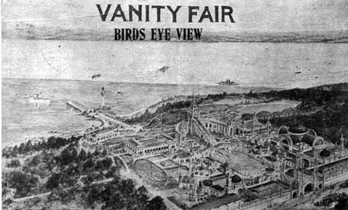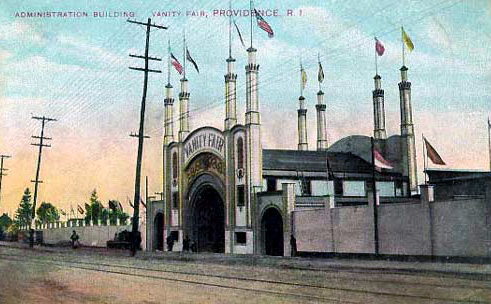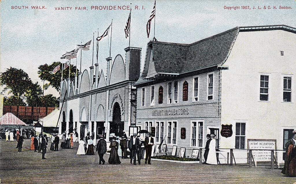 The Vanity Fair amusement park was located on the Providence River in East Providence, Rhode Island. It was in operation from 1907 to 1912, closing after a disastrous fire. The design of the park was inspired by the 1902 Pan-American Exposition in Buffalo, NY, and arranged its attractions around a “Shoot the Chutes” ride which ended in a 1,600,000 gallon pool. The attractions included shops, a vaudeville theatre, a grand ballroom, a scenic railway, a mock firefighting show, and — of course — an incubator baby exhibit.