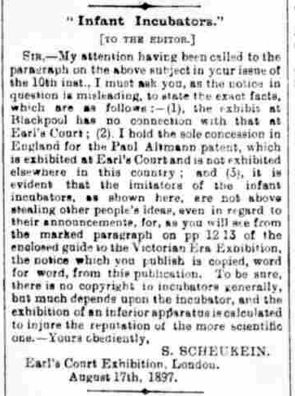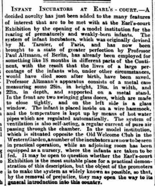 “On Monday members of the press were invited to a private view of the incubators for infants at the Victorian Era Exhibition, Earl’s-court. These are exhibited in a building facing the Welcome Club, and divided into three compartments. On one side there is sleeping accommodation for two wet nurses and for Mdlle. Louise Recht, who has been specially trained at the Paris Maternity Hospital to look after debilitated and prematurely born infants reared in incubators. A special service for this purpose was established at the Maternité in 1893, and here some 400 children, born under most unfavourable circumstances, are received annually. On the other side of the building there is a nursery, where the infants are taken to be fed and washed. The public are admitted to the central room, and here they can view the infants lying within the incubators, and are shown how the apparatus is ventilated and warmed and the temperature automatically maintained. The mechanism employed for this purpose has already been fully explained in these columns. [1] Its efficiency is now put to a practical test. Messrs. Coney and Schenbein, who are the representatives in England of this the “Altmann Incubator,” invite the criticism of the medical profession, and will supply every possible facility for the fullest investigation. They are ready to take in their charge any prematurely born child, and, apart from the trained nurse and the wet nurses, they have retained the services of two physicians, who attend three or four times a day to watch over the health of the infants. At night the watchman awakes the nurses every three hours so that they may feed the infants, and in the day time the babies are fed, generally from the breast, every two hours. In the nursery there is a small pharmacy, contrivances for sterilising milk, ingenious feeding bottles, and scales so that the infants may be weighed and their progress daily observed. A very large number of persons have already visited this exhibit, including many trained nurses. Much interest is manifested by the visitors. The incubators and the ventilating tubes are silvered, which gives them a bright and cheerful appearance, while the infants within look clean and comfortable, so that altogether it is a pleasant as well as an interesting sight.” –– The Lancet 2:161-162, July 17, 1897.