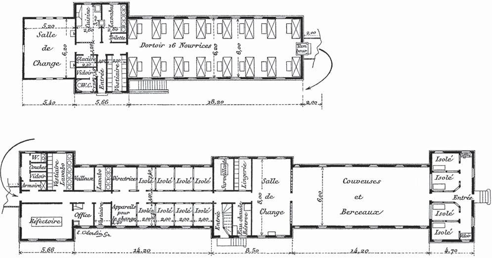 Above: The floor plan of the “weakling’s pavilion” (pavillon des débiles) at the Paris Maternité, first established in 1893 (top), and as enlarged by Budin in 1897 (bottom). The top section accommodated up to 16 wet nurses with their infants, dressing room, kitchen, washbasins and icebox. The bottom left section had eight isolation rooms for sick or potentially infected newborns, the nurses dining room, scales, bathtubs, breast pumps, and other equipment. The bottom right section had a large room for up to 16 healthy prematures in heated beds or closed incubators, four isolation chambers, and a room for bathing and dressing the babies. Source: Le Nourrisson, by P. Budin, Paris, 1900.