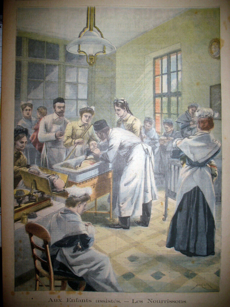 “During the early 1890s, infantile diarrhea, caused by bottle-feeding cow’s milk to infants, contributed to infant mortality, often because the milk had not be properly pasturized. Budin insisted that breast milk from women was superior to milk substitutes for infants unless they couldn’t breastfeed. In 1892, Budin founded a system of clinics at the Hôpital de la Charité that supervised the care of infants after discharge from maternity hospitals. Budin established consultations in which he met with new mothers and encouraged them to breastfeed and to monitor their infants’ weights. To encourage regular attendance for consultations, Budin provided mothers with economic incentives and gifts.”