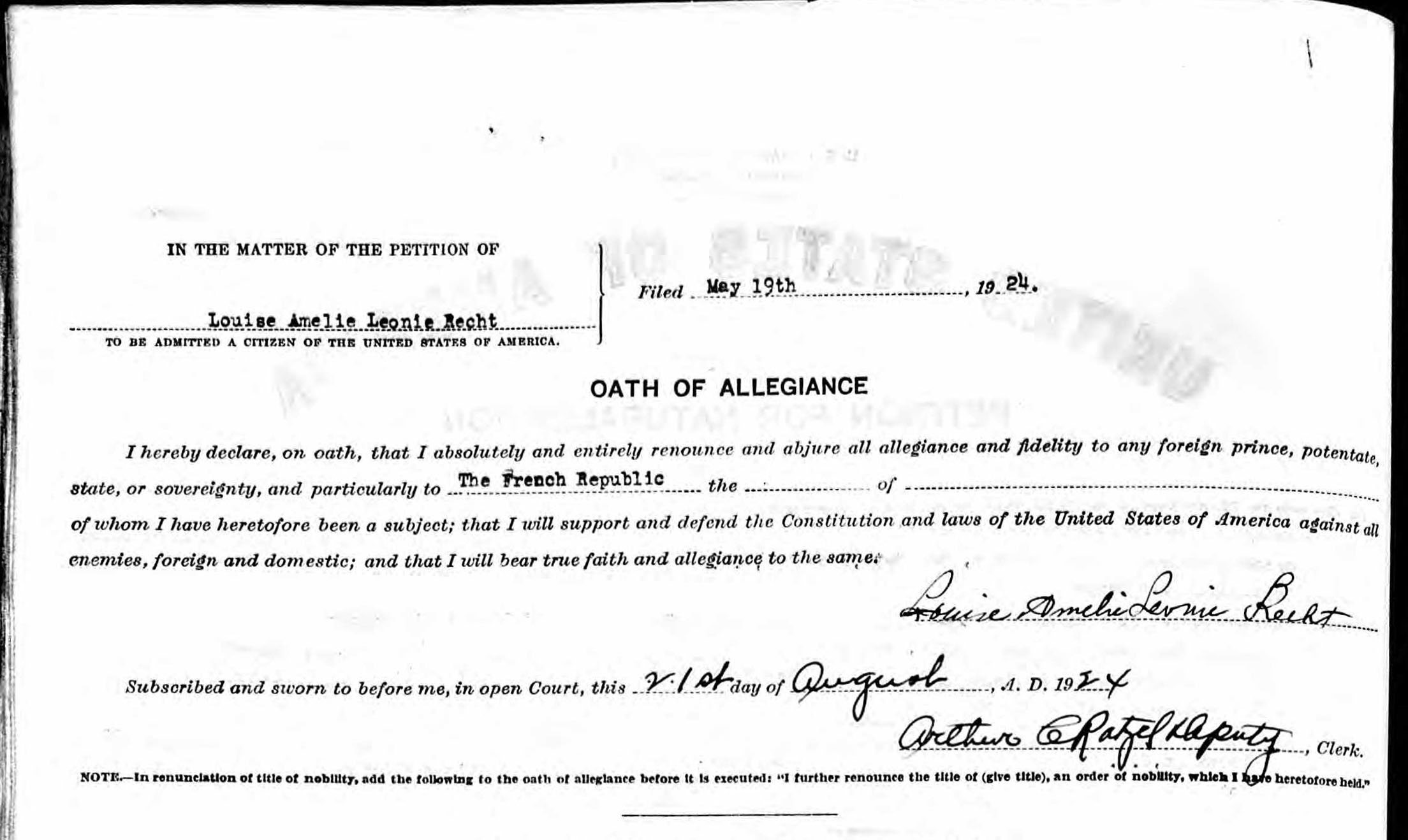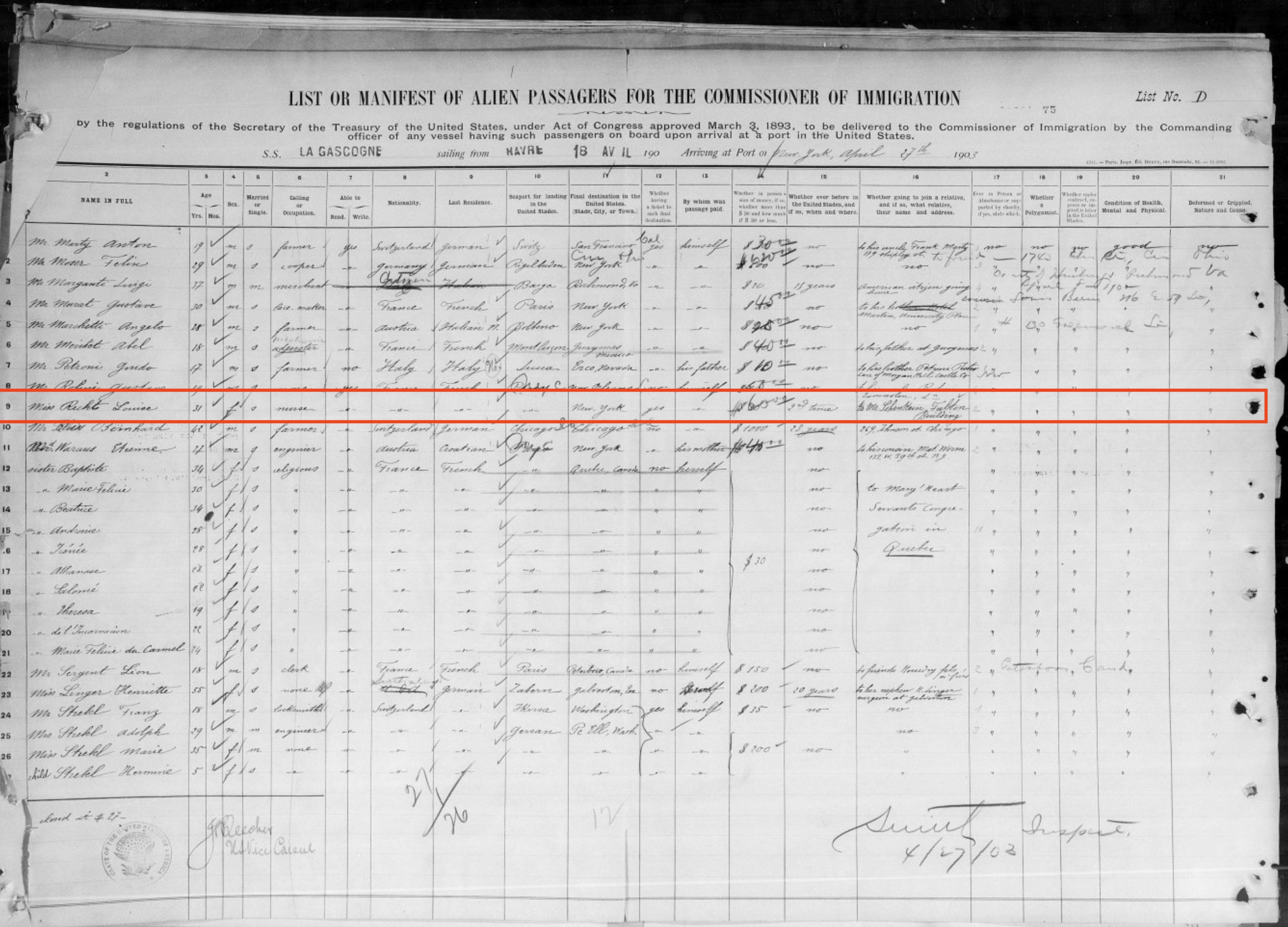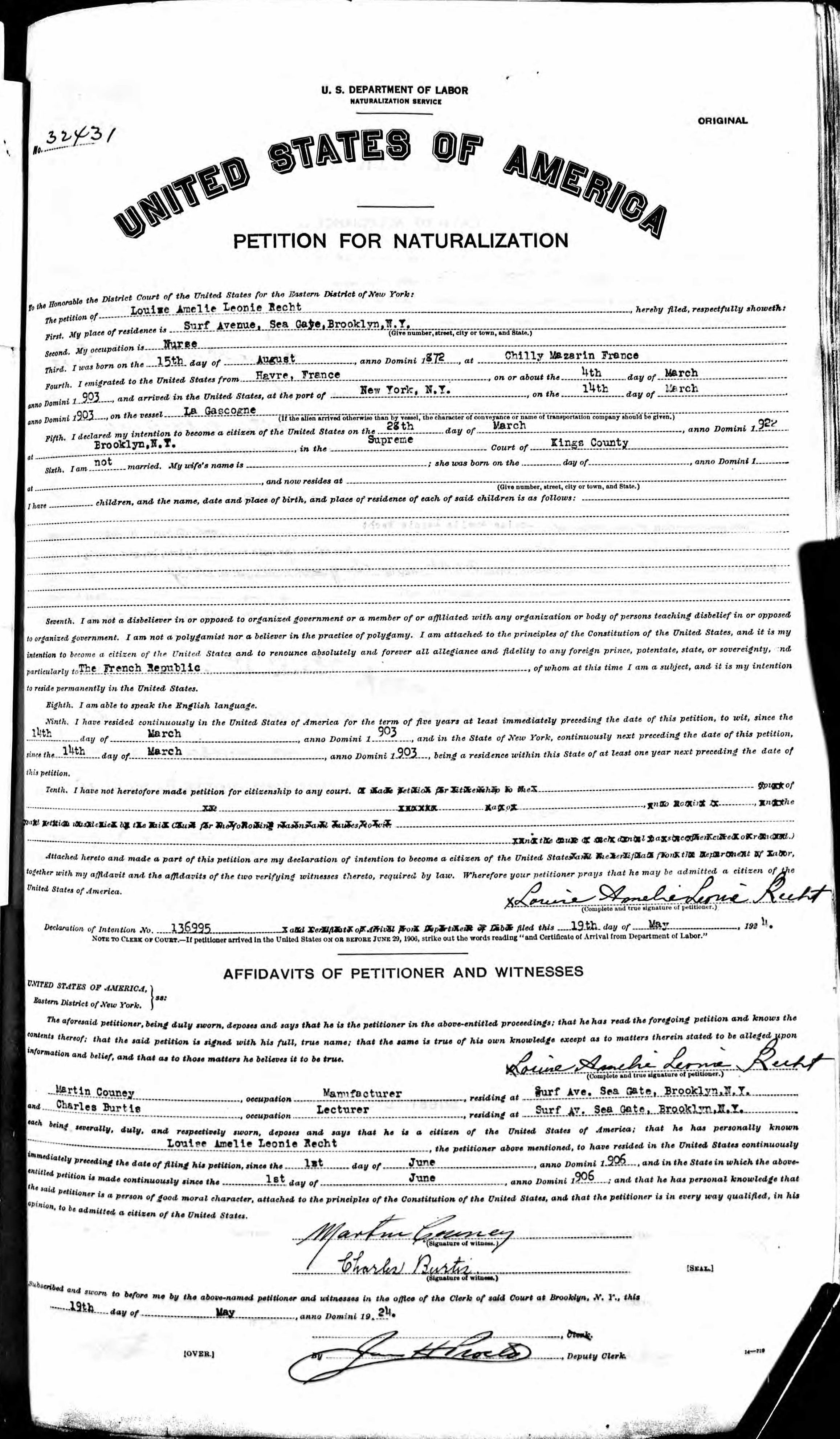 Madame Recht arrived in the United States at Ellis Island aboard La Gascogne on April 27, 1903 (passenger ID 102638030262). She gave her destination to immigration as “Mr. Schenkein at the Fulton Building,” but apparently she moved in with the Couneys immediately or shortly after her arrival. Her co-residence with the Couney family is documented in the 1920 and 1940 US Censuses. Martin Couney cosigned her petition for citizenship, and she was naturalized and took the oath of allegiance in New York on August 21, 1924. A. J. Liebling, writing in The New Yorker in 1939, described her household status plainly: “Madame Louise Recht, the head nurse, a Frenchwoman who has been Dr. Couney’s chief aide for forty-one years and always lives with the Couneys, has an adjoining room and bath.”