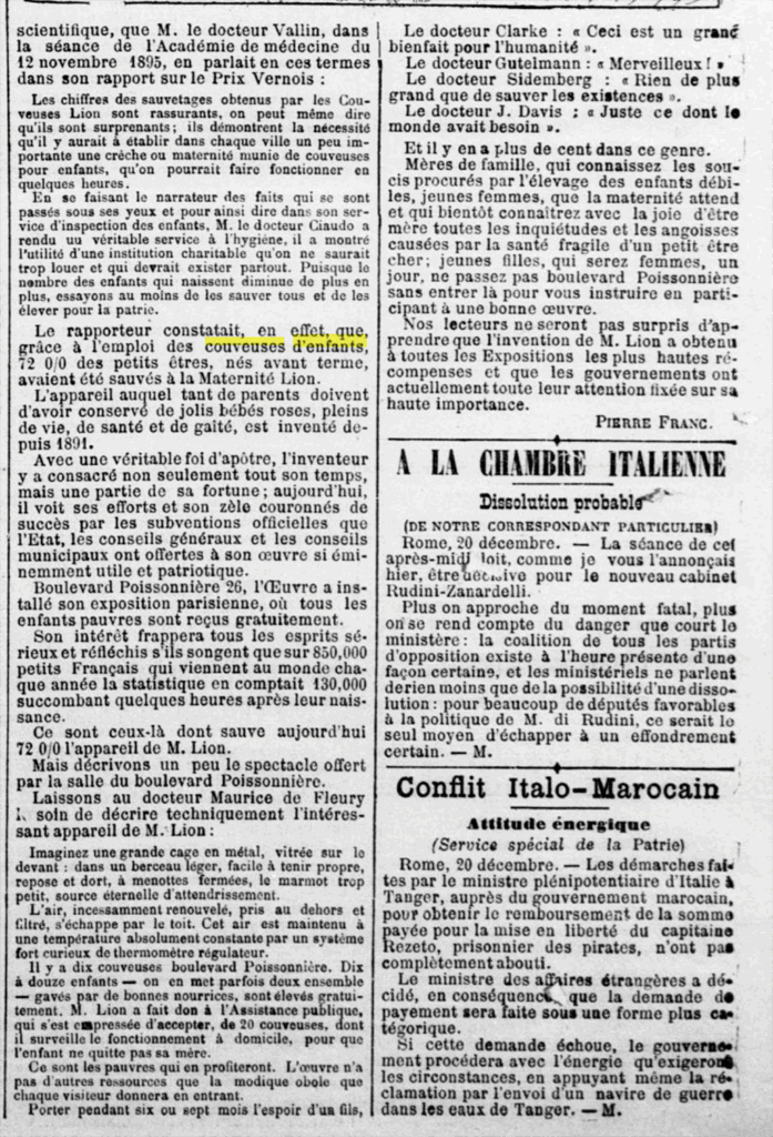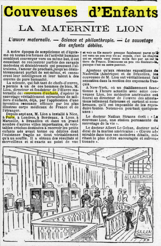 Science, which produces so many masterpieces, has enabled one of these good men, Mr. Lion, director and founder of the Maternal Incubator for Children, to perform the truly miraculous rescue of thousands of children already, through the application of an invention recognized by illustrious medical professionals in France and abroad.