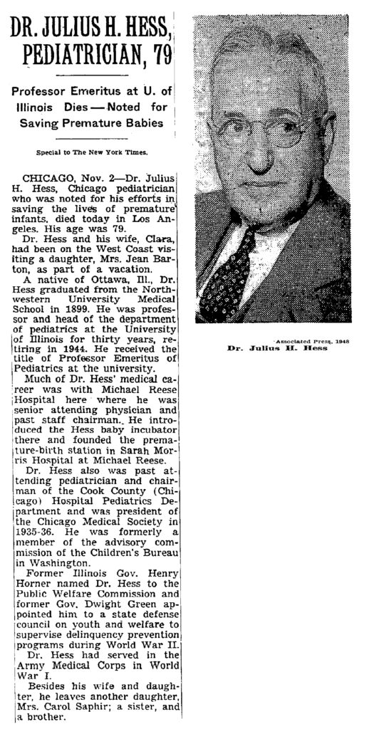 Julius Hays Hess was a Chicago pediatrician who made innovative contributions to medical research and hospital technology. He is considered the father of American neonatology.