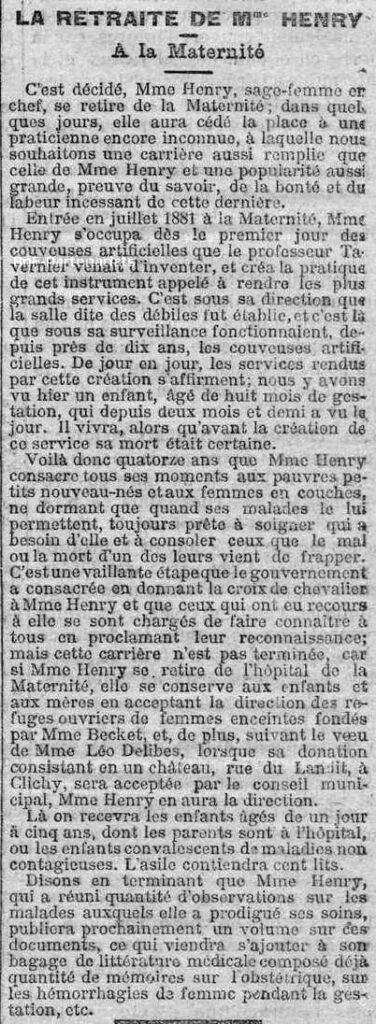 Madame Henry abruptly resigned “for personal reasons” when Dr. Tarnier retired and was succeeded as clinical chief by Dr. Pierre Budin in 1895. The unit was placed under medical direction in order to bring a scientific approach to the care of the sick newborns. The abrupt departure reflects a broader pattern of physician authority displacing midwifery leadership as neonatal care became medicalized. Her award of the Legion of Honor and her departure from the Maternité were both widely covered and discussed in the Paris popular press, an clear indication of how well she was known and respected in the region.