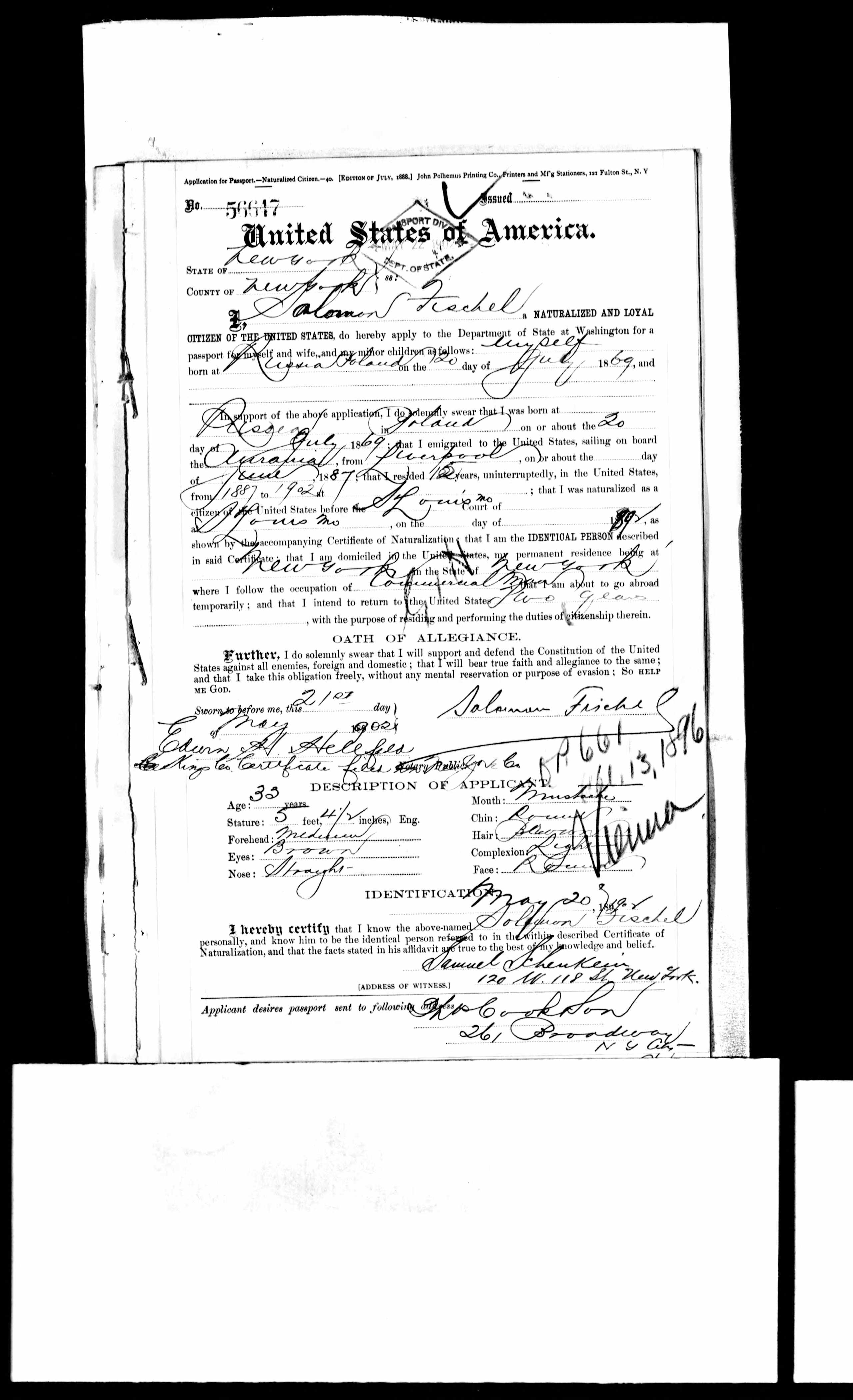 - Fischel’s 1902 Passport Application (Witnessed by Schenkein)