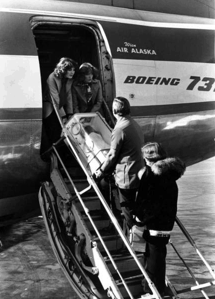 Date of photo uncertain, but probably in mid-1970's based on equipment and aircraft. Wien Air Alaska started using Boeing 737's in 1967. The airline was acquired and then liquidated in 1984. Before Wien Air folded in 1985, they were known as the second oldest airline in the United States. Photo from Alaska's Digital Archives.