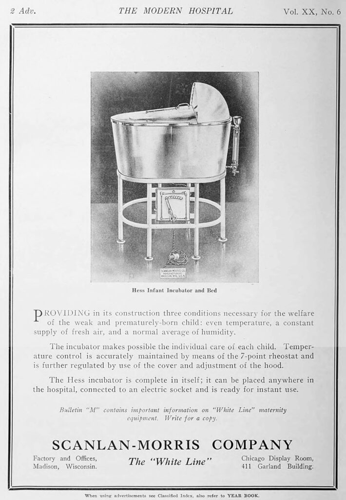 The Hess incubator was commercially manufactured and marketed by the Scanlan-Morris Company of Madison, Wisconsin. They worked closely with Dr. Hess to standardize the “Hess Infant Incubator and Bed,” selling it to hospitals across the United States. It was widely used (along with incubators of the Lion design, marketed in the US by the Kny-Scheerer Company) until the 1940s when the “Isolette” (a commercialized version of the “Chapple Incubator” manufactured by Air-Shields) introduced the use of transparent plastics and more advanced forced-air convection.