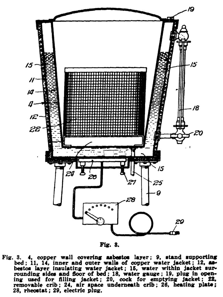 Around 1922, Hess refined the design into a portable “bed” that could be used for transport or stationary care. This version included a specialized oxygen hood, recognizing that premature infants often needed respiratory support as much as warmth.