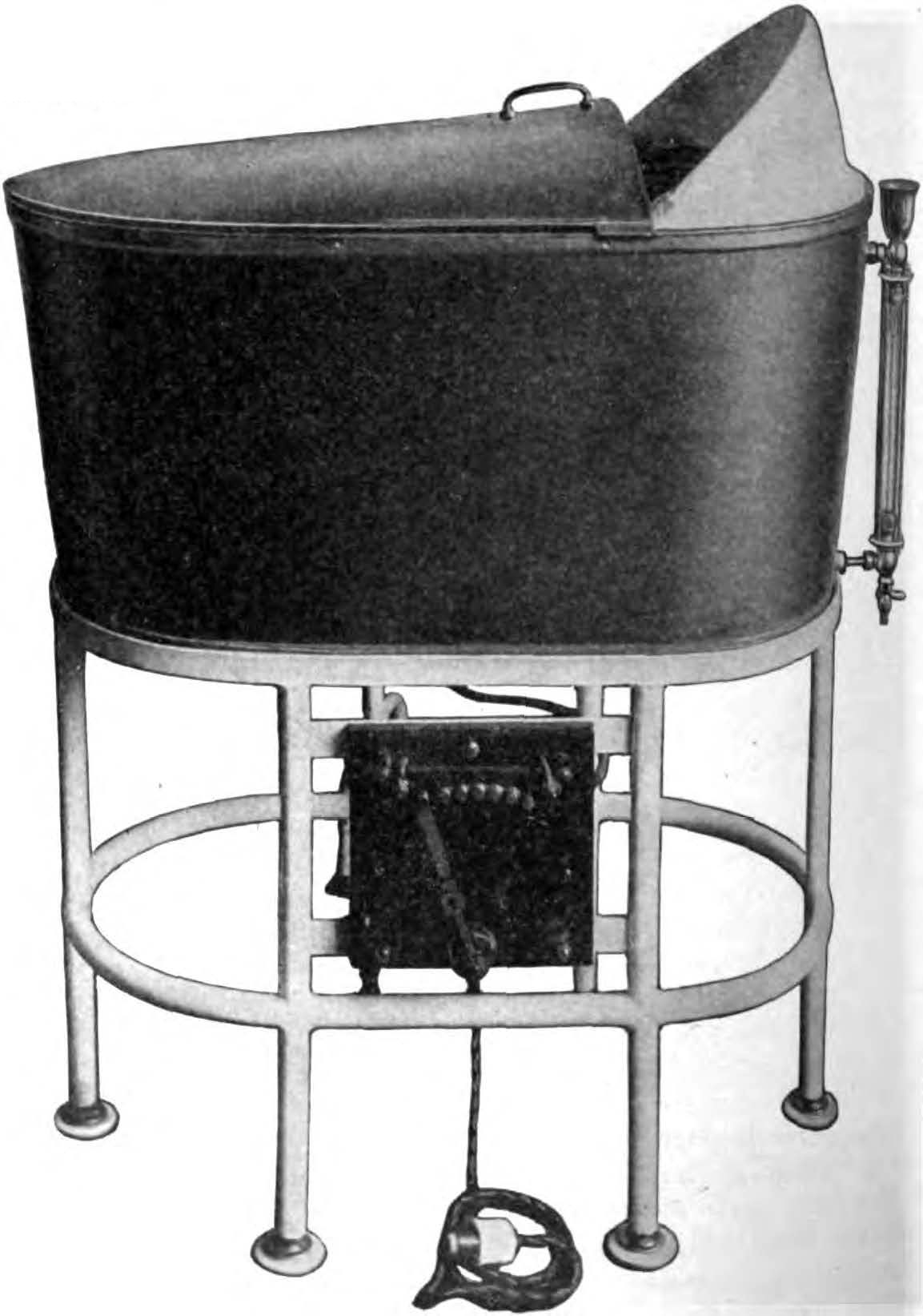 1. A stove with a 6-inch surface specially constructed to carry a maximum capacity of 300 watts (ordinary 6-inch places have a capacity approximating 440 watts), which makes it impossible to heat the water above 155, at a room temperature of 75 F. This stove rests on a drop in the metal top of the standard, and can be raised or lowered by the four thumb screws seen in Figure 2, by which means the stove can be brought into direct contact with the floor of the water jacket. This is essential to the proper heating of the water and the prevention of overheating of the stove.