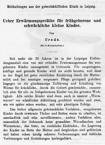 For more than 20 years, a warming tub for newborns, which I devised, has been in continuous use at the Leipzig Maternity Hospital. It is not used for full-term, strong, and healthy children, because these generally thrive with good, plentiful nutrition through breast milk and other careful care. On the other hand, the consistent supply and maintenance of warmth is of the utmost importance for sickly children, those weakened by birth, and especially for all premature babies. All such children have been protected from harmful cooling in our “warming tub,” and, as we will see later, with very positive results.