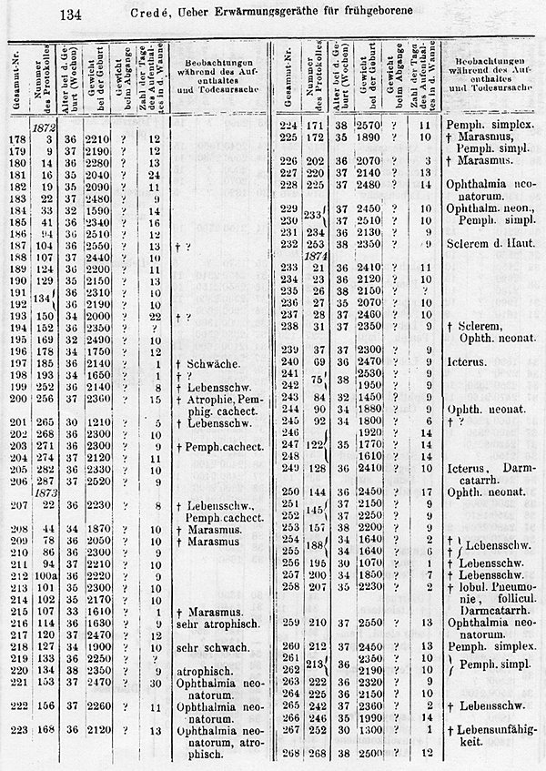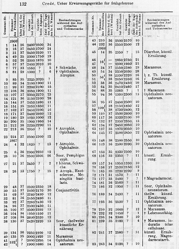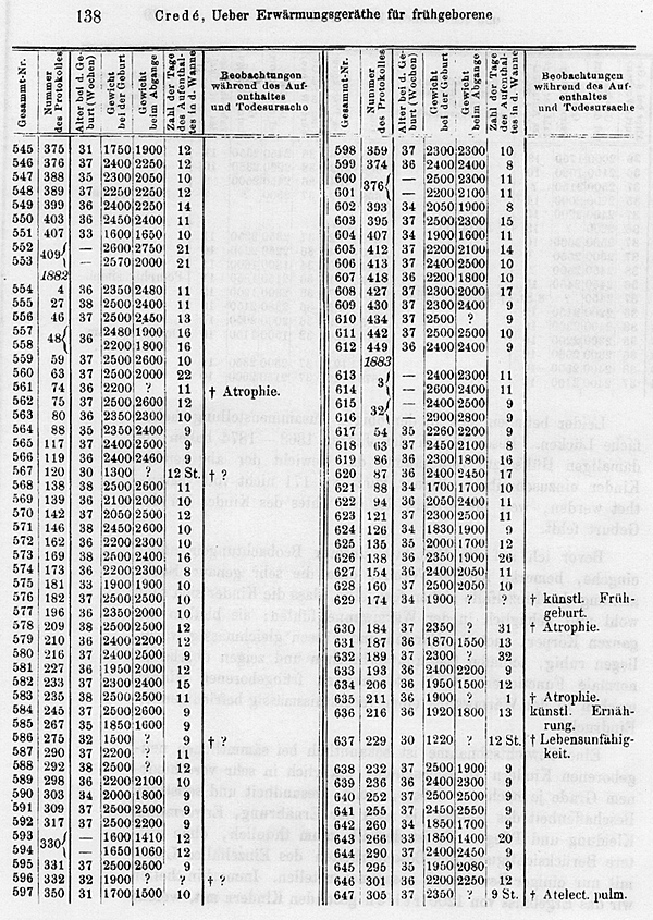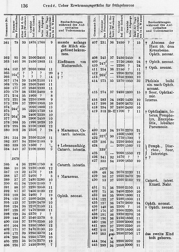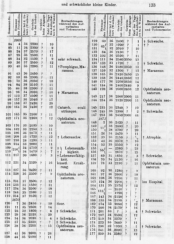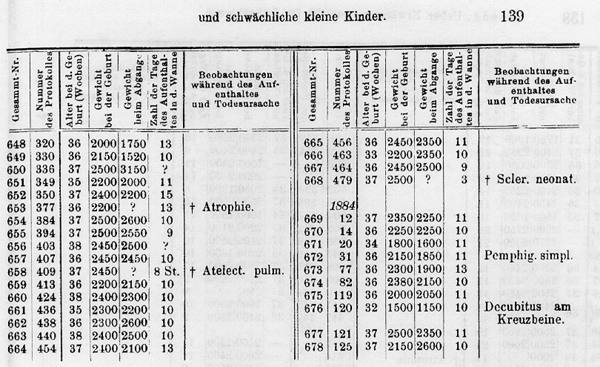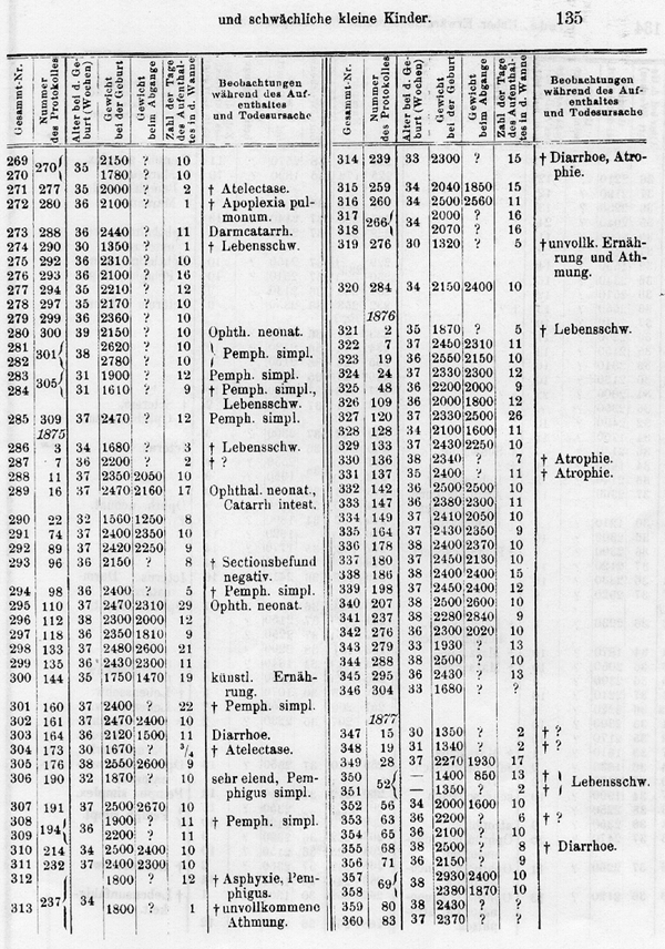 Since its introduction, all children born in the institution who weighed less than or only slightly more than 2500 g have been placed in the warming tub. In addition, a number of somewhat larger children, even those who were mature but sick or weakened by childbirth, also benefited from the benefits of the warming tub until they recovered. The following table includes only prematurely born children. The table begins in 1866 because records for previous years are insufficient.