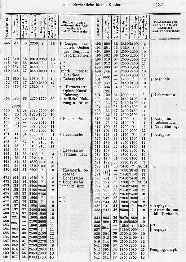 Hieraus geht hervor, dass Kinder, welche bei ihrer Geburt höchstens 1500 g wiegen, nur ganz ausnahmweise am Leben erhalten werden können, selbst wenn ihnen die allergrösste Sorgfalt in Bezug auf Ernährung durch Muttermilch und gleichmässige Wärmezufuhr zu Theil wird. Immerhin darf jede Hoffnung auf Lebensrettung nicht aufgegeben werden.